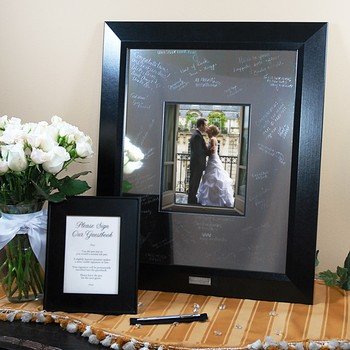 Our Contemporary Signature Picture Frame with Engraved Photo Mat is one of our most unique keepsakes to date! It combines contemporary style to an age old wedding tradition. Fashioned with an ultra creative metal photo mat, this statuesque wooden frame not only holds one of your favorite 8 x 10 pictures, but it also doubles as a guest book alternative, allowing all your friends and family to sign their names and well wishes.Personalized free of charge, this fabulous frame and signature mat will be a keepsake that you'll treasure for years to come. And don't let this signature memento go to waste. It also works famously for bridal showers, anniversaries, graduations, going away parties and every special occasion in between! Set includes wooden picture frame, micro fiber polishing cloth, guest instruction card and signature engraving scribe.Details:Size: Measures 20 1/2" by 25 inches. Holds an 8 x 10 photo and up to 175 signatures. Materials: Wooden frame, plexiglass and metal micro fiber matEngraving Options:The Contemporary Signature Picture Frame with Engraved Photo Mat may be engraved with two block first names and a wedding date or two block custom lines (max of 24 characters per line) on a silver plate at No Additional Cost. Silver plate has adhesive backing for placement of your choice upon arrival.