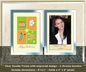 - The chrome bordered opening on the left side of the frame includes a Happy Birthday message in a whimsical birthday design.